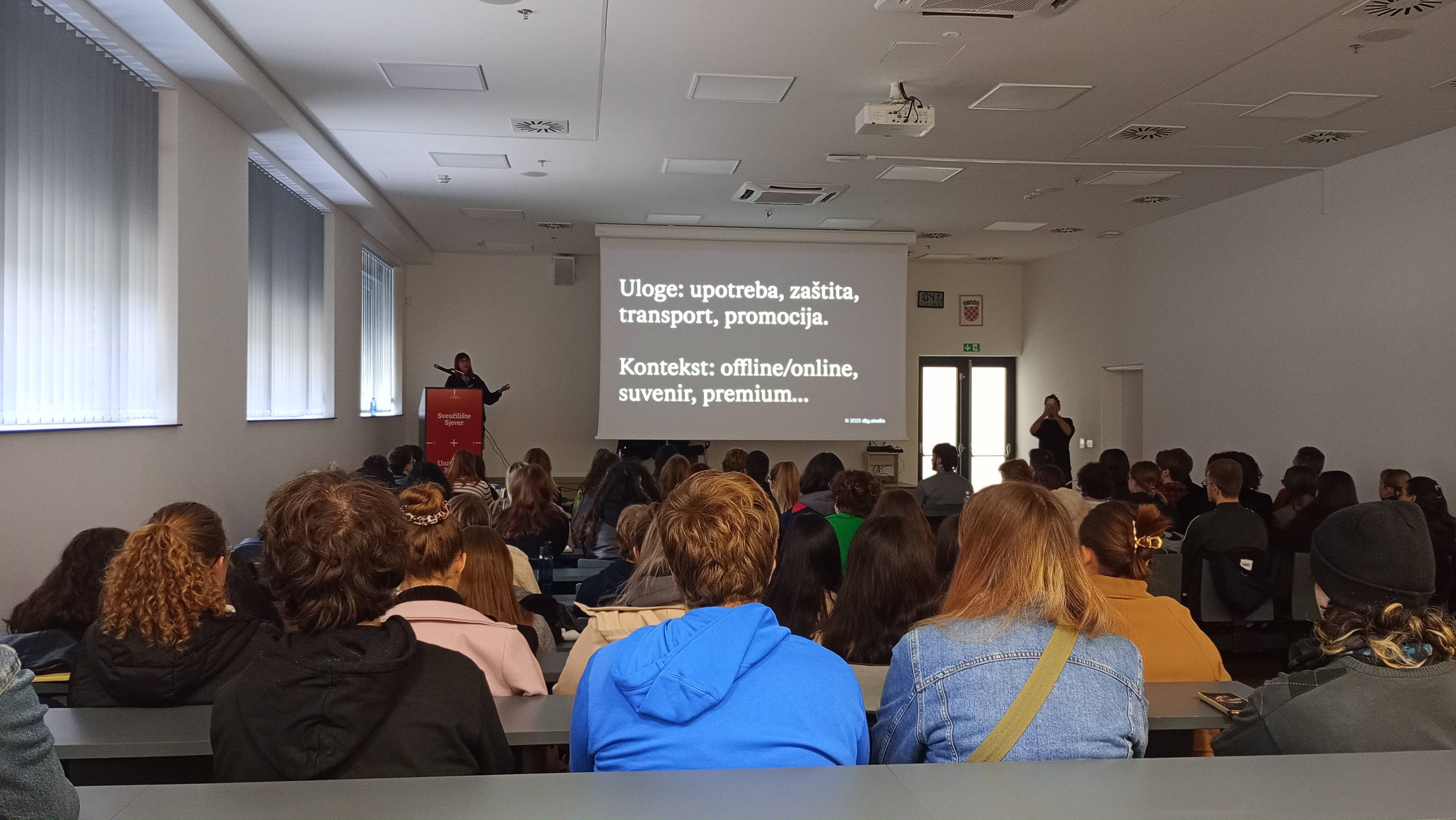 10. studenoga 2025. na Sveučilištu Sjever održano je gostujuće predavanje Dig studija, jednog od najistaknutijih kreativnih studija u Zagrebu, specijaliziranog za branding, dizajn ambalaže i vizualne identitete. Studio vode dizajneri Izvorka Jurić i Jurica Kos, čiji su radovi višestruko nagrađivani na međunarodnim natjecanjima. Današnja predavačica Izvorka Jurić predstavila nam je širok raspon proizvoda kreativnih vizualnih rješenja, od kojih svaki priča svoju priču. Publiku su činili studenti medijskoga dizajna Sveučilišta Sjever te dio polaznika nastave Medijske kulture Gimnazije „Fran Galović“ Koprivnica u pratnji profesora Kresojevića. Predavanje je trajalo oko sat vremena, a nakon njega mogla su se postaviti pitanja i pobliže pogledati dizajniranu ambalažu. Uz buduće stručnjake za medijski dizajn predavanje je zainteresiralo i one manje upućene u temu jer svi poznajemo snagu brandinga i važnost komunikacije. Saša Kresojević