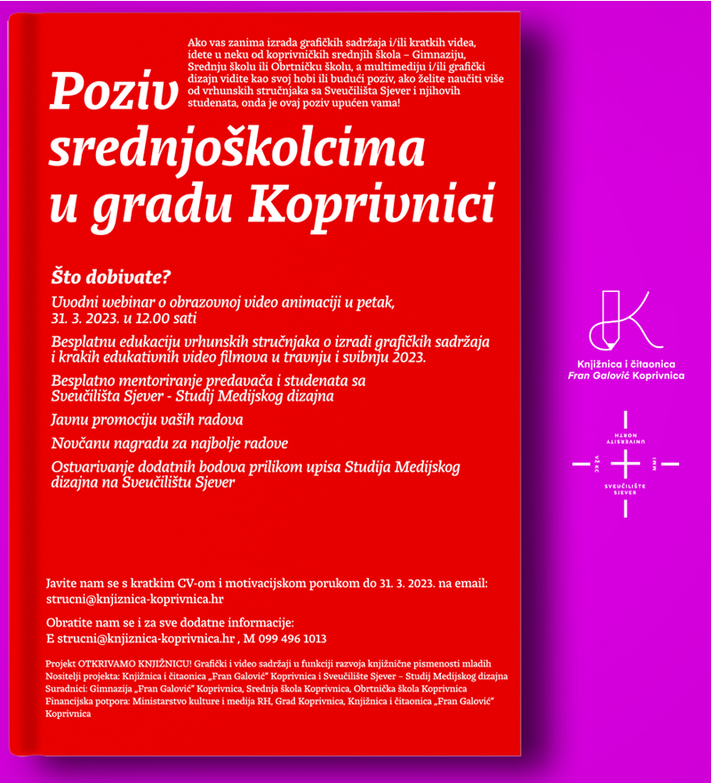 Knjižnicu i čitaonicu „Fran Galović“ Koprivnica provodi projekt OTKRIVAMO KNJIŽNICU! Grafički i video sadržaji u funkciji razvoja knjižnične pismenosti mladih. Ciljana skupina našeg projekta su mladi – učenici koprivničkih srednjih škola koje zanima grafičko oblikovanje i izrada videa. Glavni cilj nam je populariziranje i približavanje knjižnice mladima na način koji je blizak njihovim interesima za medijskim izražavanjem, konkretno izradom grafičkih sadržaja i kratkih edukativnih videa. Uz besplatnu edukaciju stručnjaka – predavača na studiju Medijskog dizajna Sveučilišta Sjever u projektu smo predvidjeli i novčane nagradu za najbolje radove kao i mogućnost da ostvare dodatne bodove prilikom upisa studija Medijskog dizajna na Sveučilištu Sjever. Molimo vas da nam pomognete u promociji, odnosno širenju informacija među učenicima vaše škole preko profesora i školskih knjižničara te stavljanjem Poziva za iskazivanjem interesa u privitku na mrežne stranice, društvene mreže i email komunikaciju. Rok da se jave u Knjižnicu je 31. 3. 2023.